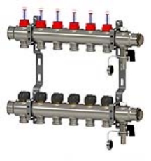 Ansamblul colector/distribuitor din seria 08M este realizat din oțel inoxidabil și are în componență suporți de prindere, 2 aerisitoare manuale, 2 robinete de golire, 2 dopuri, robinete termostatabile și debitmetre.