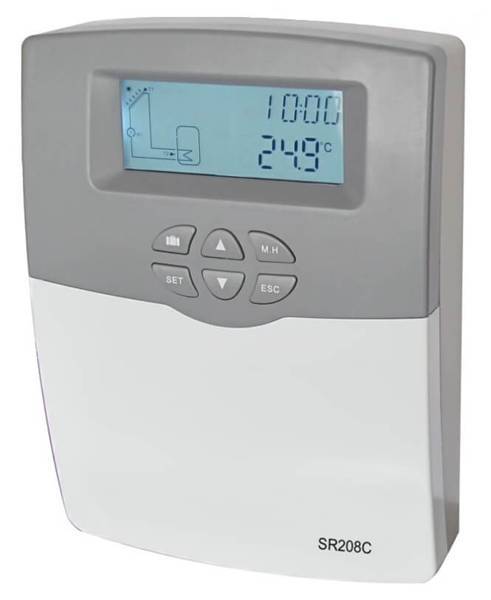 SR 208C este un regulator diferenţial de temperatură pentru sisteme solare termice, cu 3 intrări şi 2 ieşiri. Gestionează funcționarea unui sistem solar format dintr-un câmp solar + un rezervor + o pompă de circulație solară cu turație variabilă + încălzirea auxiliară cu rezistență electrică a rezervorului.